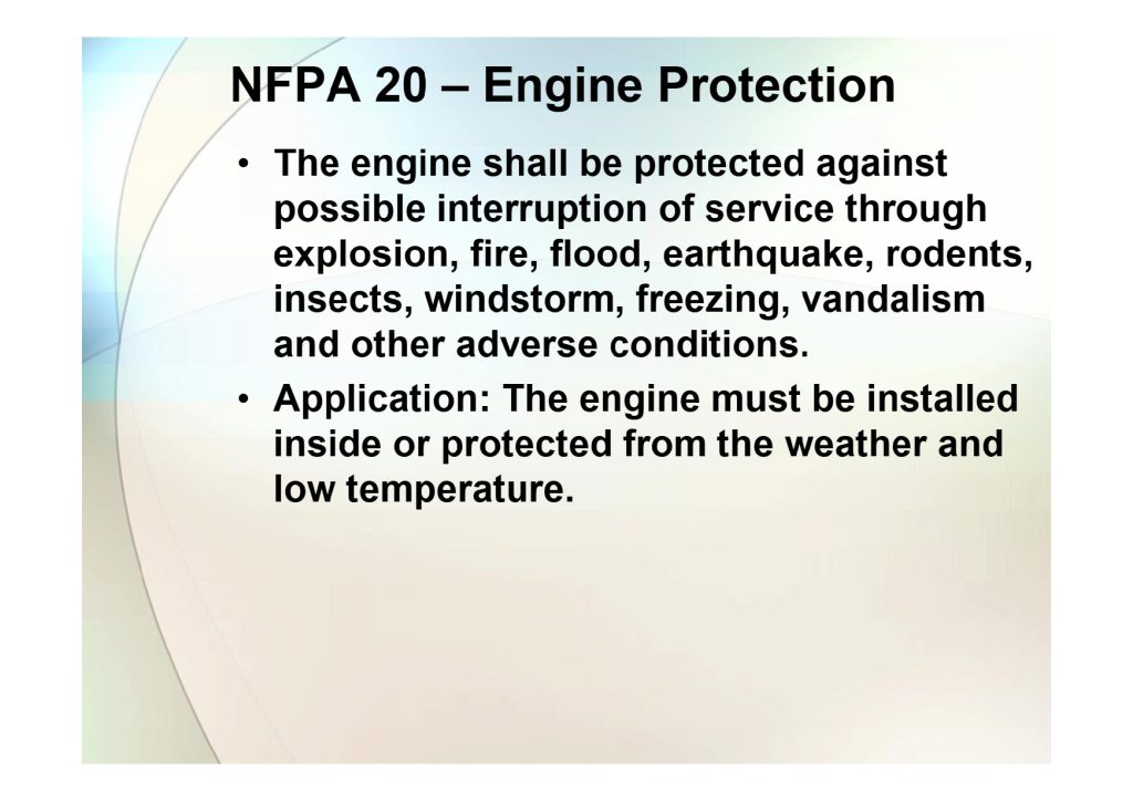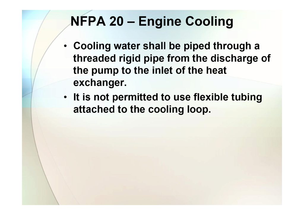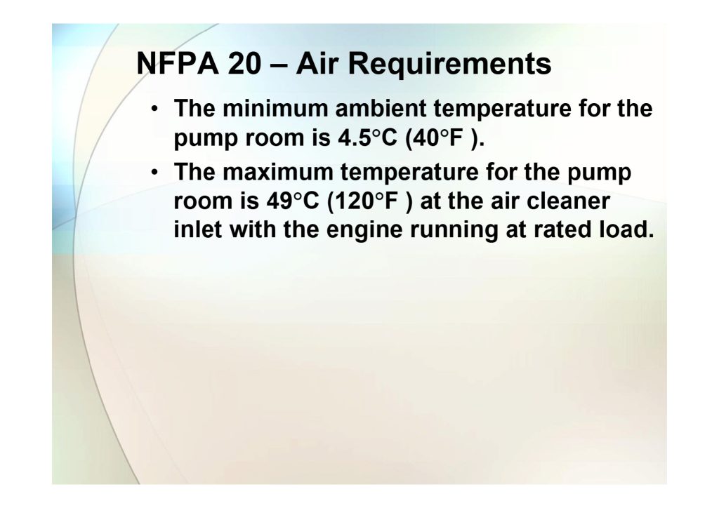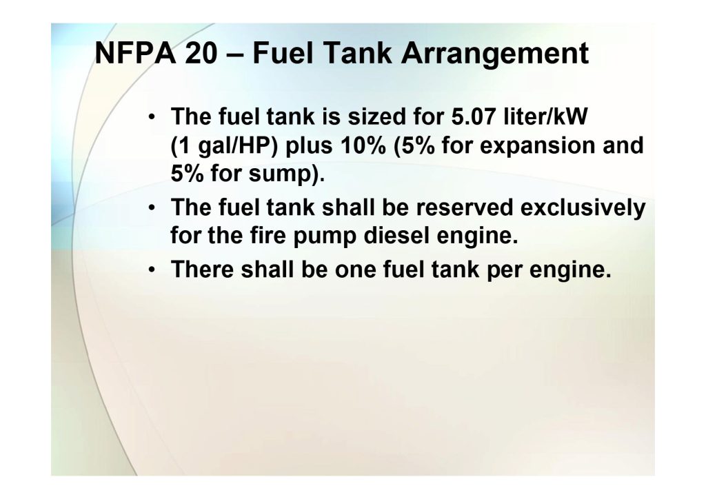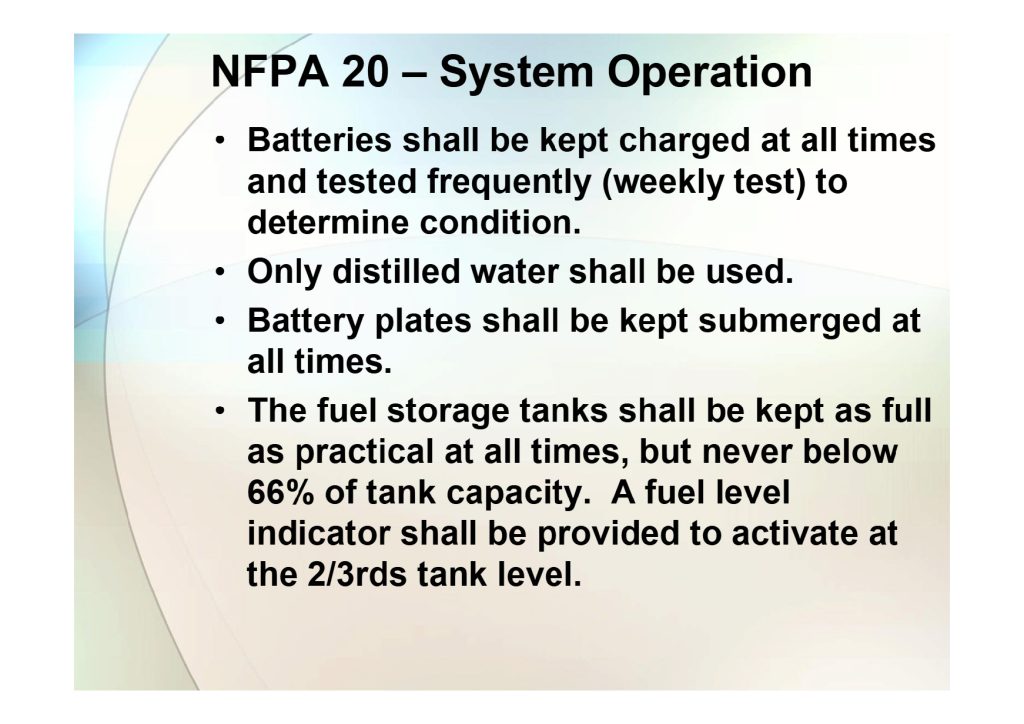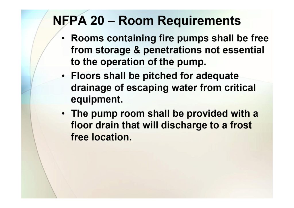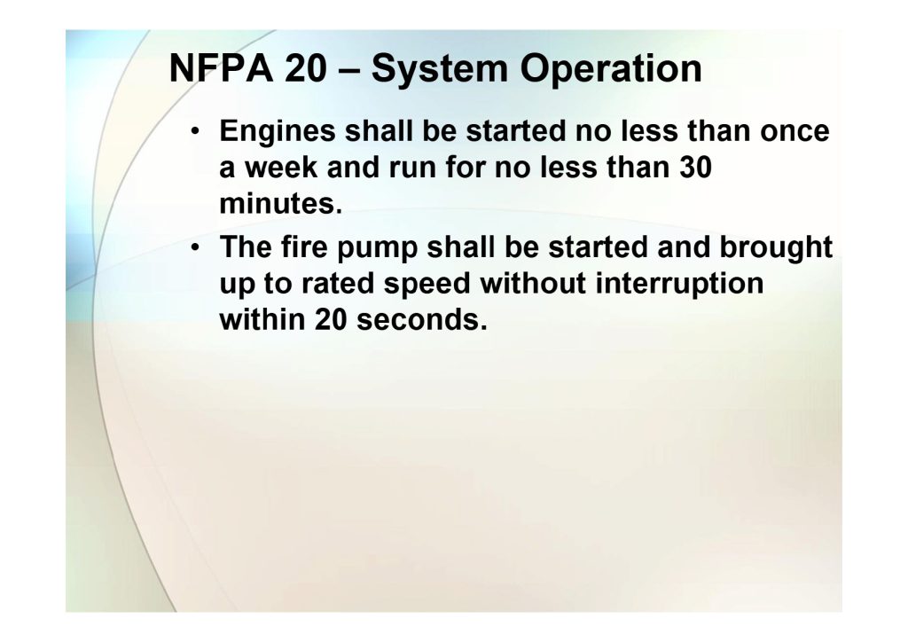 The National Fire Protection Association (NFPA) Standard 20 sets the guidelines for the installation of stationary fire pumps. Its goal is to ensure: