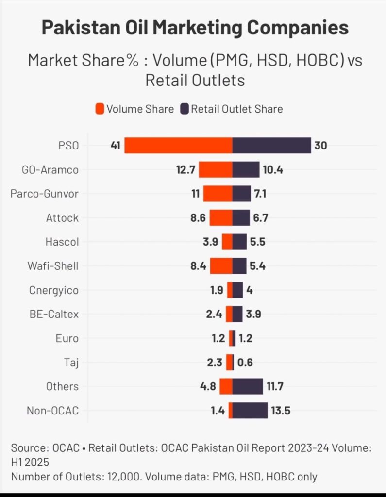 The oil and gas sector in Pakistan is a highly competitive industry, with Oil Marketing Companies (OMCs) playing a vital role in fuel distribution across the country. According to the Oil Companies Advisory Council (OCAC) Pakistan Oil Report 2023-24 and H1 2025 sales data, the top 10 OMCs control 74.8% of retail outlets yet contribute 93.8% of total fuel volumes (Petrol/PMG, Diesel/HSD, and HOBC).